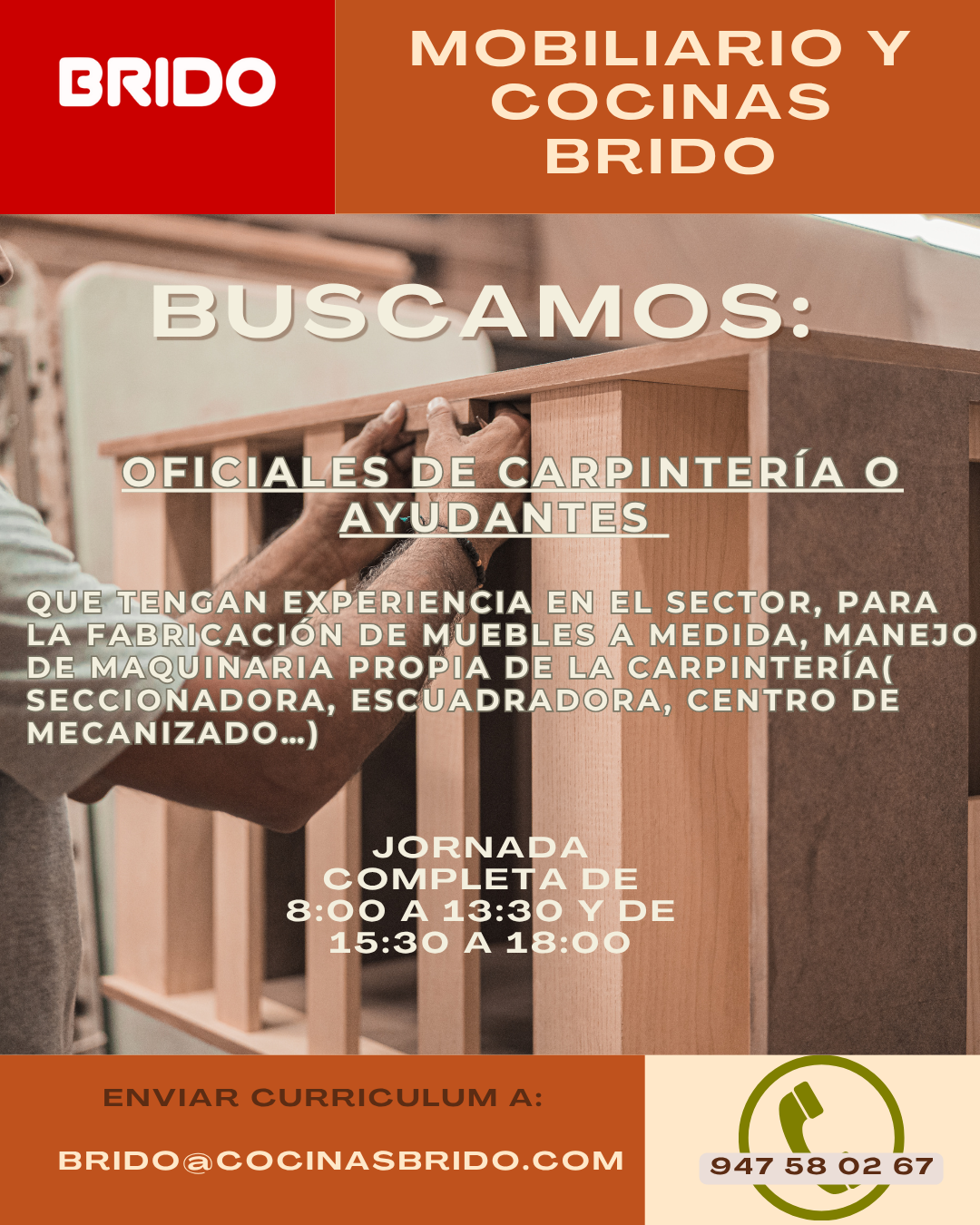 2025-06-06 𝐎𝐅𝐄𝐑𝐓𝐀 𝐃𝐄 𝐄𝐌𝐏𝐋𝐄𝐎 de la empresa BRIDO Oficiales de carpintería o ayudantes Más información👇